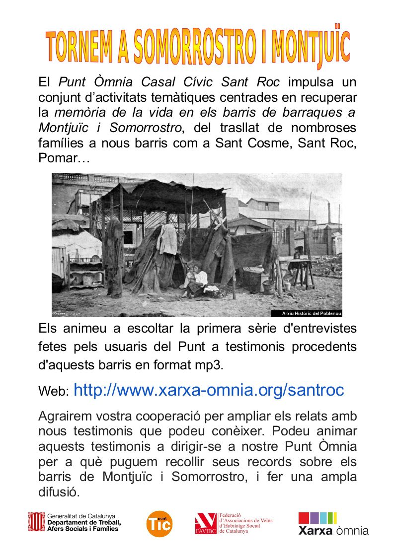 Destaquem la sèrie de relats i testimonis que els participants graven al Punt. El primer participant va ser José i va ser entrevistat per el jove Youssef del Club Infants i Joves de l’Òmnia en format MP3: ♬ Testimoni1: Relat de vida als barris de barraques Montjuïc Somorrostro de José […]