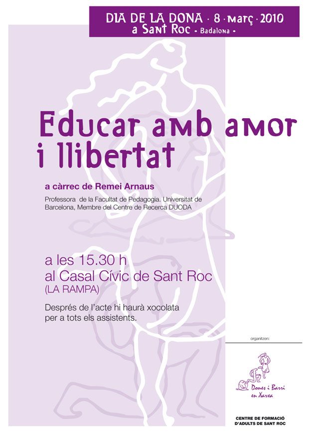 En el marc de la celebració del Dia de la Dona, la xerrada «Educar amb amor i llibertat» esta organitzada el 8 de març 2010 a les 15h30 al Casal Cívic de Sant Roc (la rampa). Intervindrà el professor de pedagogia Remei Arnaus de la Universitat de Barcelona. Després, hi haurà xocolata per […]
