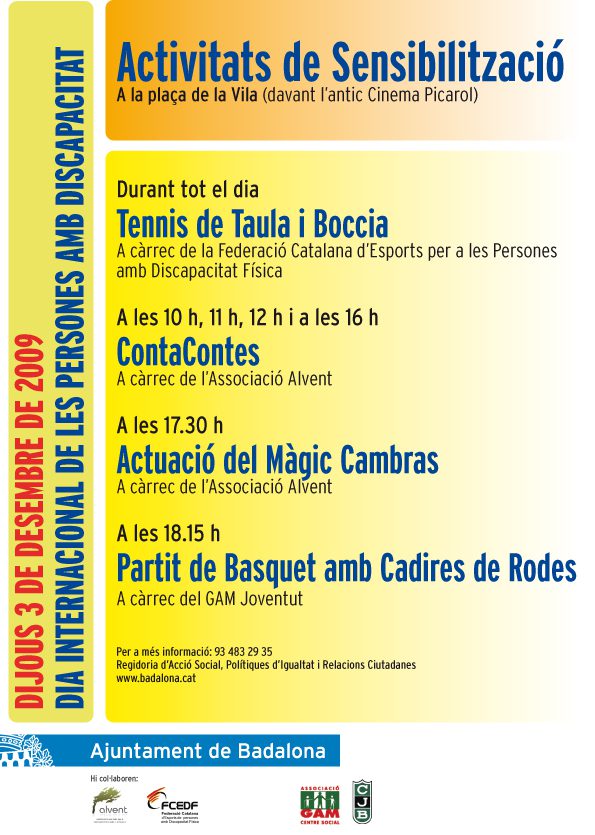 El 3 de Desembre 2009, cel·lebrem el Dia Internacional de les Persones amb Discapacitat a Badalona. Òmnia Sant Roc i l’Associació GAM donen suport a aquesta celebració. – El programa de la jornada preveu moltes activitats: . Mostra d’Entitats a Plaça de la Vila . Activitats de sensibilització . Exposicions […]