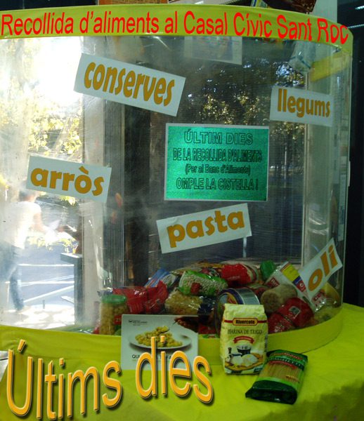 Manquen pocs dies ! ! ! Participeu a la recollida d’aliments destinada al Banc d’Aliments i organitzada pel Casal Cívic Sant Roc. Av. del Maresme 182-190 Els esperem a tots plegats! Enllaç: Activitats solidàries – Alimentació en temps de crisi.