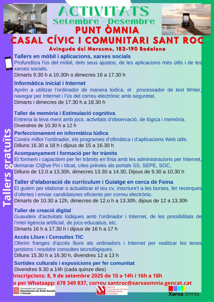 Envia per WhatsApp al 678349837 un missatge per confirmar el teu interès en un taller concret i reservar una plaça per el primer trimestre 2026.