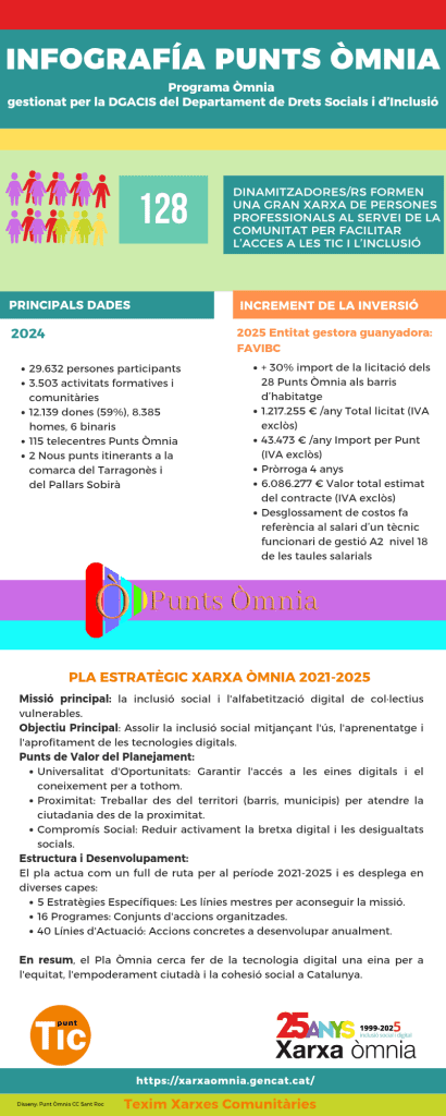 Es va treballar amb els usuaris les eines de la Intel·ligència Artificial per realitzar aquesta infografia amb la finalitat de posar en relleu el paper fonamental dels Punts Òmnia en la Comunitat i dels professionals dinamitzadors que faciliten la inclusió socidigital de la ciutadania i especialment de les persones vulnerables i en risc d’exclusió social..